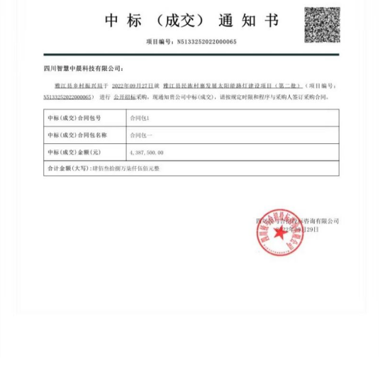 今年9月28日,四川智慧中晨科技有限公司與雅江縣鄉村振興局本著新農村發展建設項目的原則達成了雅江縣民族村寨發展太陽能路燈建設項目的的第一批與第二批的戰略協議。第一批主要采購內容為:太陽能路燈650盞同時需要安裝完成650盞路燈,需要滿足的要求為高7米。總預算為4499996元人民幣,中標金額為4387500元人民幣 。第二批的采購內容為太陽能路燈606盞同時需要安裝完成606盞路燈,需要滿足的要求為高7米。總預算為4240995元人民幣,中標金額為4090500元人民幣 。整體工期為60-90天完工。此次也是為雅江縣民族村寨發展促進做出的又一重大舉措。此次能夠順利中標是智慧中晨科技公司發展實施邁下堅實的一步。相信在的中晨智慧科技公司嚴謹做事的態度下,經過正常保障的工期里,一定會把雅江縣民族村寨路燈照明這塊得到完善的改進,同時也會為整個村寨建設發展成為重要的一點。
